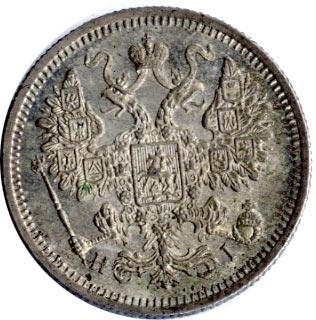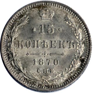 Лицевая сторона — гербовый орел, оборотная —обозначение номинала (15 копеекъ), окруженное венком из лавровой и дубовой ветвей и дата.