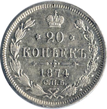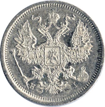 Лицевая сторона — гербовый орел, оборотная —обозначение номинала (20 копеекъ), окруженное венком из лавровой и дубовой ветвей и дата.