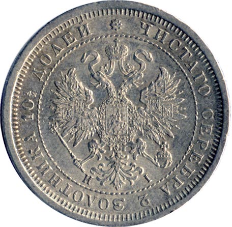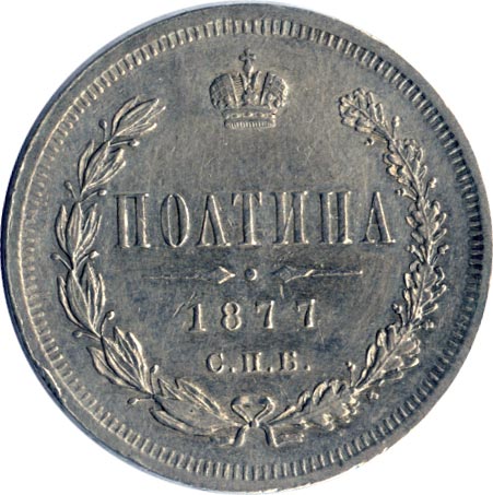 Лицевая сторона — гербовый орел и надпись «ЧИСТОГО СЕРЕБРА 2 ЗОЛОТНИКА 10 ДОЛЕЙ», оборотная — обозначение номинала «ПОЛТИНА», окруженное венком из лавровой и дубовой ветвей и дата.