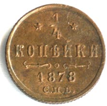 Лицевая сторона — вензель Александра II в венке из лавровой и дубовой ветвей; оборотная — обозначение номинала (1/4 копейки) и дата. Нормативный вес — 0,82 грамма, гурт рубчатый.