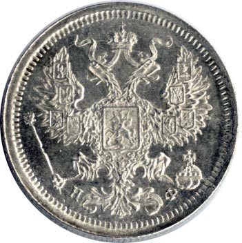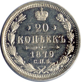Лицевая сторона — гербовый орел, оборотная —обозначение номинала (20 копеекъ), окруженное венком из лавровой и дубовой ветвей и дата.