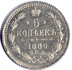 Лицевая сторона — гербовый орел, оборотная —обозначение номинала (5 копеекъ), окруженное венком из лавровой и дубовой ветвей и дата.