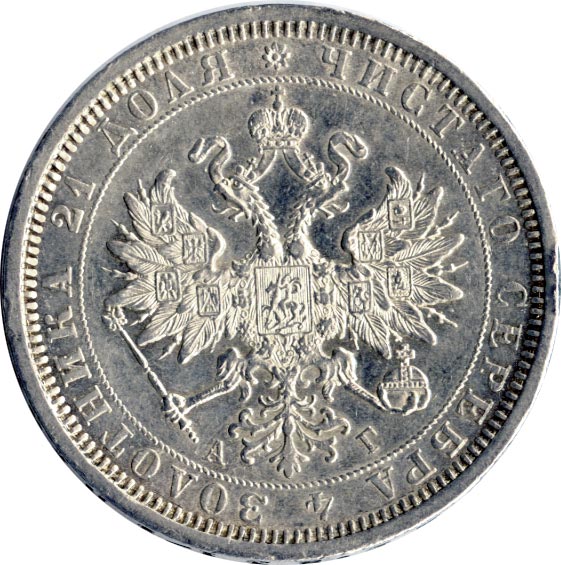 Лицевая сторона — гербовый орел и надпись «ЧИСТОГО СЕРЕБРА 4 ЗОЛОТНИКА 21 ДОЛЯ», оборотная — обозначение номинала «РУБЛЬ», окруженное венком из лавровой и дубовой ветвей и дата.