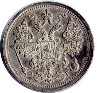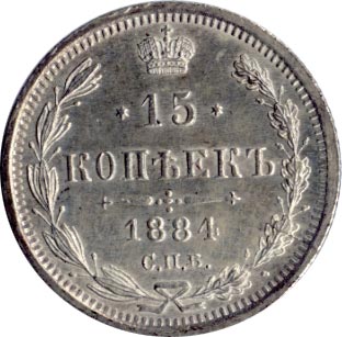 Лицевая сторона — гербовый орел, оборотная —обозначение номинала (15 копеекъ), окруженное венком из лавровой и дубовой ветвей и дата.