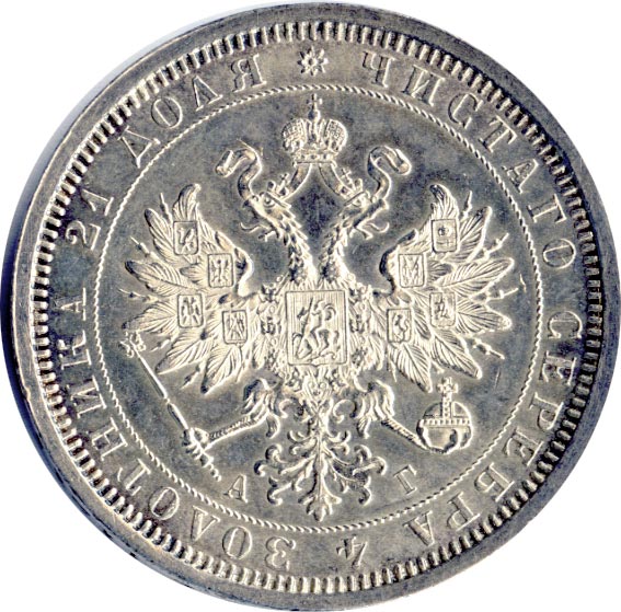 Лицевая сторона — гербовый орел и надпись «ЧИСТОГО СЕРЕБРА 4 ЗОЛОТНИКА 21 ДОЛЯ», оборотная — обозначение номинала «РУБЛЬ», окруженное венком из лавровой и дубовой ветвей и дата.