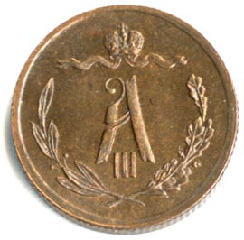 Указом от 21 марта 1867 года Александр II утверждает 50-рублевую стопу для медных монет. Новые монеты получают усложненное оформление, дополнительным отличием от прежних выпусков служит рубчатый гурт (чеканка ведется без предварительного гурчения кружков в неразъемном рубчатом кольце).