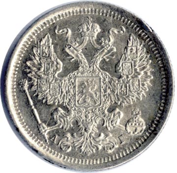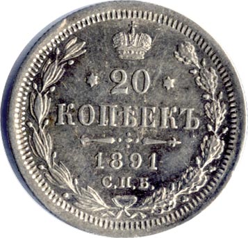 Лицевая сторона — гербовый орел, оборотная —обозначение номинала (20 копеекъ), окруженное венком из лавровой и дубовой ветвей и дата.