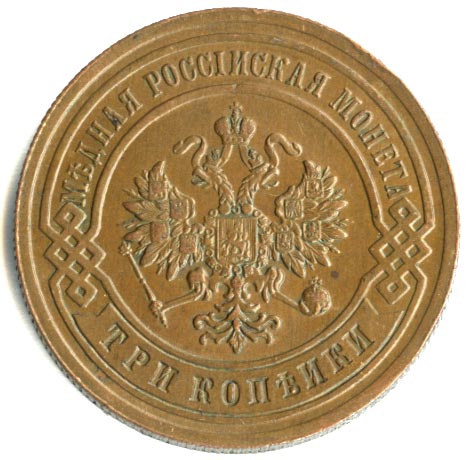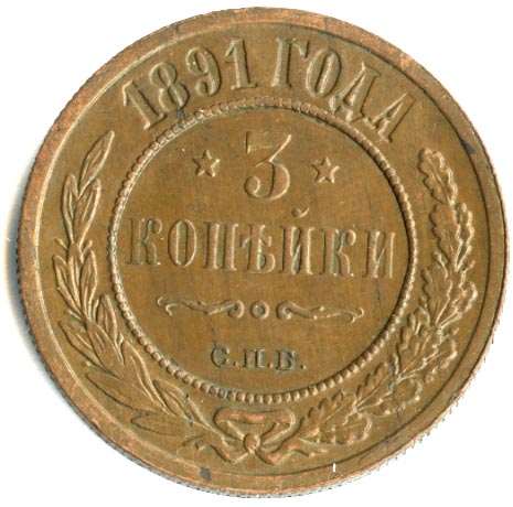 Лицевая сторона — двуглавый орел, надпись МЕДНАЯ РОССIЙСКАЯ МОНЕТА и обозначение номинала (три копейки); оборотная — обозначение номинала (3 копейки) в бусовом ободке и дата. Нормативный вес — 9,83 грамма, гурт рубчатый.
