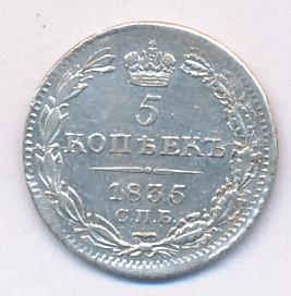Лицевая сторона — новый гербовый орел с поднятыми крыльями, оборотная —обозначение номинала (5 копеекъ), окруженное венком из лавровой и дубовой ветвей и дата. Проба — 868, нормативный вес — 1,04 грамма.