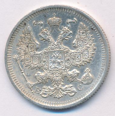 Лицевая сторона — гербовый орел, оборотная —обозначение номинала (20 копеекъ), окруженное венком из лавровой и дубовой ветвей и дата.