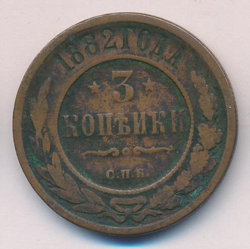 Лицевая сторона — двуглавый орел, надпись МЕДНАЯ РОССIЙСКАЯ МОНЕТА и обозначение номинала (три копейки); оборотная — обозначение номинала (3 копейки) в бусовом ободке и дата. Нормативный вес — 9,83 грамма, гурт рубчатый.