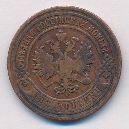 Лицевая сторона — двуглавый орел, надпись МЕДНАЯ РОССIЙСКАЯ МОНЕТА и обозначение номинала (две копейки); оборотная — обозначение номинала (2 копейки) в бусовом ободке и дата. Нормативный вес — 6,55 грамма, гурт рубчатый.