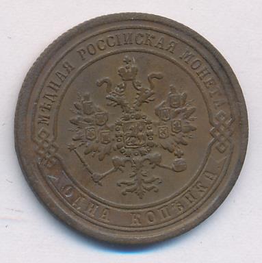 Лицевая сторона — двуглавый орел, надпись МЕДНАЯ РОССIЙСКАЯ МОНЕТА и обозначение номинала (одна копейка); оборотная — обозначение номинала (1 копейка) в бусовом ободке и дата. Нормативный вес — 3,28 грамма, гурт рубчатый.