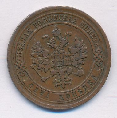 Лицевая сторона — двуглавый орел, надпись МЕДНАЯ РОССIЙСКАЯ МОНЕТА и обозначение номинала (одна копейка); оборотная — обозначение номинала (1 копейка) в бусовом ободке и дата. Нормативный вес — 3,28 грамма, гурт рубчатый.