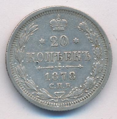 Лицевая сторона — гербовый орел, оборотная —обозначение номинала (20 копеекъ), окруженное венком из лавровой и дубовой ветвей и дата.