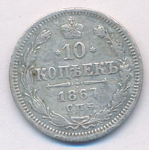 Лицевая сторона — гербовый орел, оборотная —обозначение номинала (10 копеекъ), окруженное венком из лавровой и дубовой ветвей и дата.