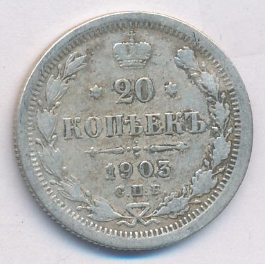 Лицевая сторона — гербовый орел, оборотная —обозначение номинала (20 копеекъ), окруженное венком из лавровой и дубовой ветвей и дата.