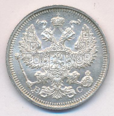 Лицевая сторона — гербовый орел, оборотная —обозначение номинала (20 копеекъ), окруженное венком из лавровой и дубовой ветвей и дата.