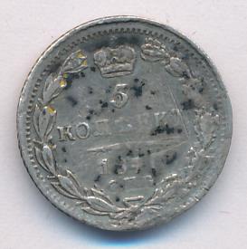 Лицевая сторона — новый гербовый орел с поднятыми крыльями, оборотная —обозначение номинала (5 копеекъ), окруженное венком из лавровой и дубовой ветвей и дата. Проба — 868, нормативный вес — 1,04 грамма.