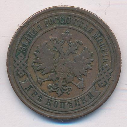 Лицевая сторона — двуглавый орел, надпись МЕДНАЯ РОССIЙСКАЯ МОНЕТА и обозначение номинала (две копейки); оборотная — обозначение номинала (2 копейки) в бусовом ободке и дата. Нормативный вес — 6,55 грамма, гурт рубчатый.