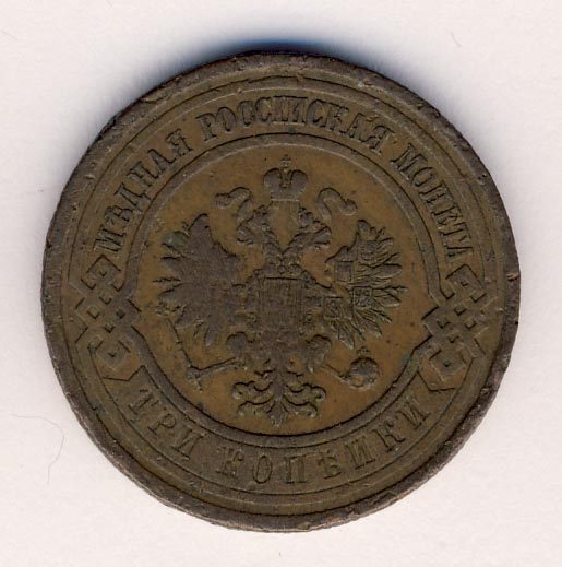 Лицевая сторона — двуглавый орел, надпись МЕДНАЯ РОССIЙСКАЯ МОНЕТА и обозначение номинала (три копейки); оборотная — обозначение номинала (3 копейки) в бусовом ободке и дата. Нормативный вес — 9,83 грамма, гурт рубчатый.