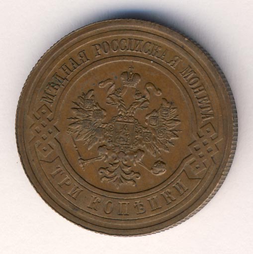 Лицевая сторона — двуглавый орел, надпись МЕДНАЯ РОССIЙСКАЯ МОНЕТА и обозначение номинала (три копейки); оборотная — обозначение номинала (3 копейки) в бусовом ободке и дата. Нормативный вес — 9,83 грамма, гурт рубчатый.
