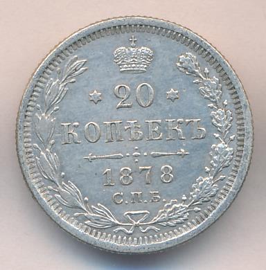 Лицевая сторона — гербовый орел, оборотная —обозначение номинала (20 копеекъ), окруженное венком из лавровой и дубовой ветвей и дата.