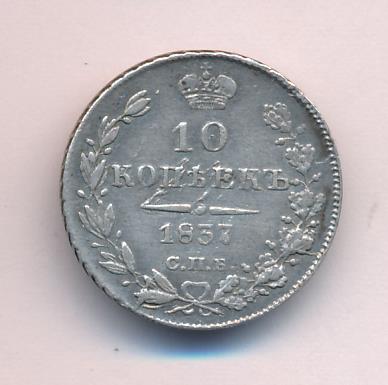 Лицевая сторона — новый гербовый орел с поднятыми крыльями, оборотная —обозначение номинала (10 копеекъ), окруженное венком из лавровой и дубовой ветвей и дата. Проба — 868, нормативный вес — 2,07 грамма.