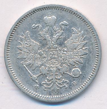 Лицевая сторона — гербовый орел, оборотная —обозначение номинала (20 копеекъ), окруженное венком из лавровой и дубовой ветвей и дата.