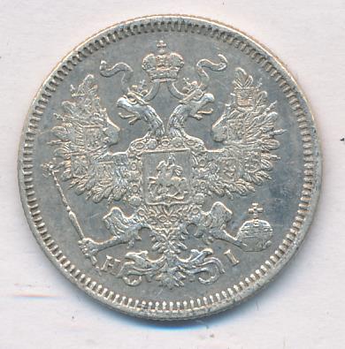 Лицевая сторона — гербовый орел, оборотная —обозначение номинала (20 копеекъ), окруженное венком из лавровой и дубовой ветвей и дата.