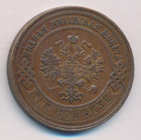 Лицевая сторона — двуглавый орел, надпись МЕДНАЯ РОССIЙСКАЯ МОНЕТА и обозначение номинала (три копейки); оборотная — обозначение номинала (3 копейки) в бусовом ободке и дата. Нормативный вес — 9,83 грамма, гурт рубчатый.