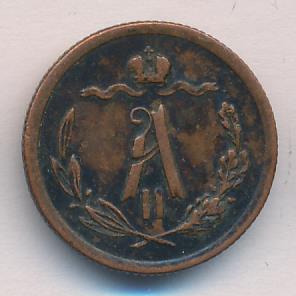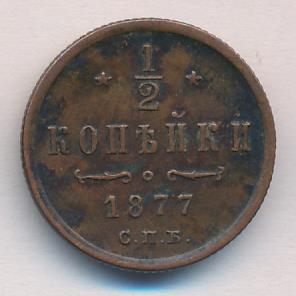 Лицевая сторона — вензель Александра II в венке из лавровой и дубовой ветвей; оборотная — обозначение номинала (1/2 копейки) и дата. Нормативный вес — 1,64 грамма, гурт рубчатый.