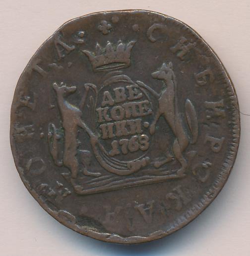 Лицевая сторона - два соболя поддерживают щит с обозначением номинала (две копейки) под короной, надпись «СИБИРСКАЯ МОНЕТА». Оборотная — вензель Екатерины II в венке из пальмовой и лавровой ветвей. Гурт — надпись «колыванская медь» или шнур. Вес — 13,10 грамма.