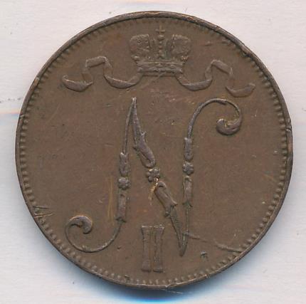 Лицевая сторона — вензель Александра II, оборотная — номинал (5 PENNIA) и дата. Нормативный вес — 6,40 грамма, гурт гладкий.