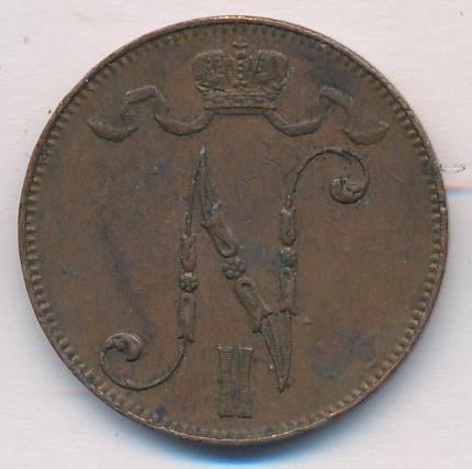 Лицевая сторона — вензель Александра II, оборотная — номинал (5 PENNIA) и дата. Нормативный вес — 6,40 грамма, гурт гладкий.