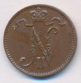 Лицевая сторона — вензель Александра II, оборотная — номинал (1 PENNIA) и дата. Нормативный вес — 1,28 грамма, гурт гладкий.