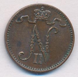 Лицевая сторона — вензель Александра II, оборотная — номинал (1 PENNIA) и дата. Нормативный вес — 1,28 грамма, гурт гладкий.
