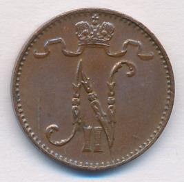 Лицевая сторона — вензель Александра II, оборотная — номинал (1 PENNIA) и дата. Нормативный вес — 1,28 грамма, гурт гладкий.