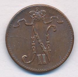 Лицевая сторона — вензель Александра II, оборотная — номинал (1 PENNIA) и дата. Нормативный вес — 1,28 грамма, гурт гладкий.