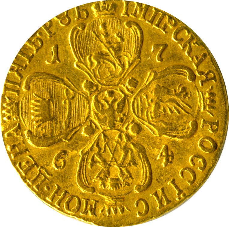 В правление Екатерины II золотые монеты сохраняют свой ставший уже привычным вид, а их количество многократно возрастает. Постепенно золото занимает устойчивое место в денежном обращении.