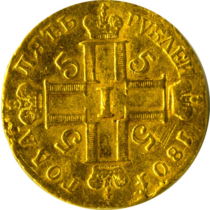 Прерывается традиция выпуска десятирублевых империалов с крестообразной композицией из пяти гербов. В начале правления выпускаются только червонные, а затем полуимпериал — пятирублевик с крестообразной монограммой из четырех П и I в центре.