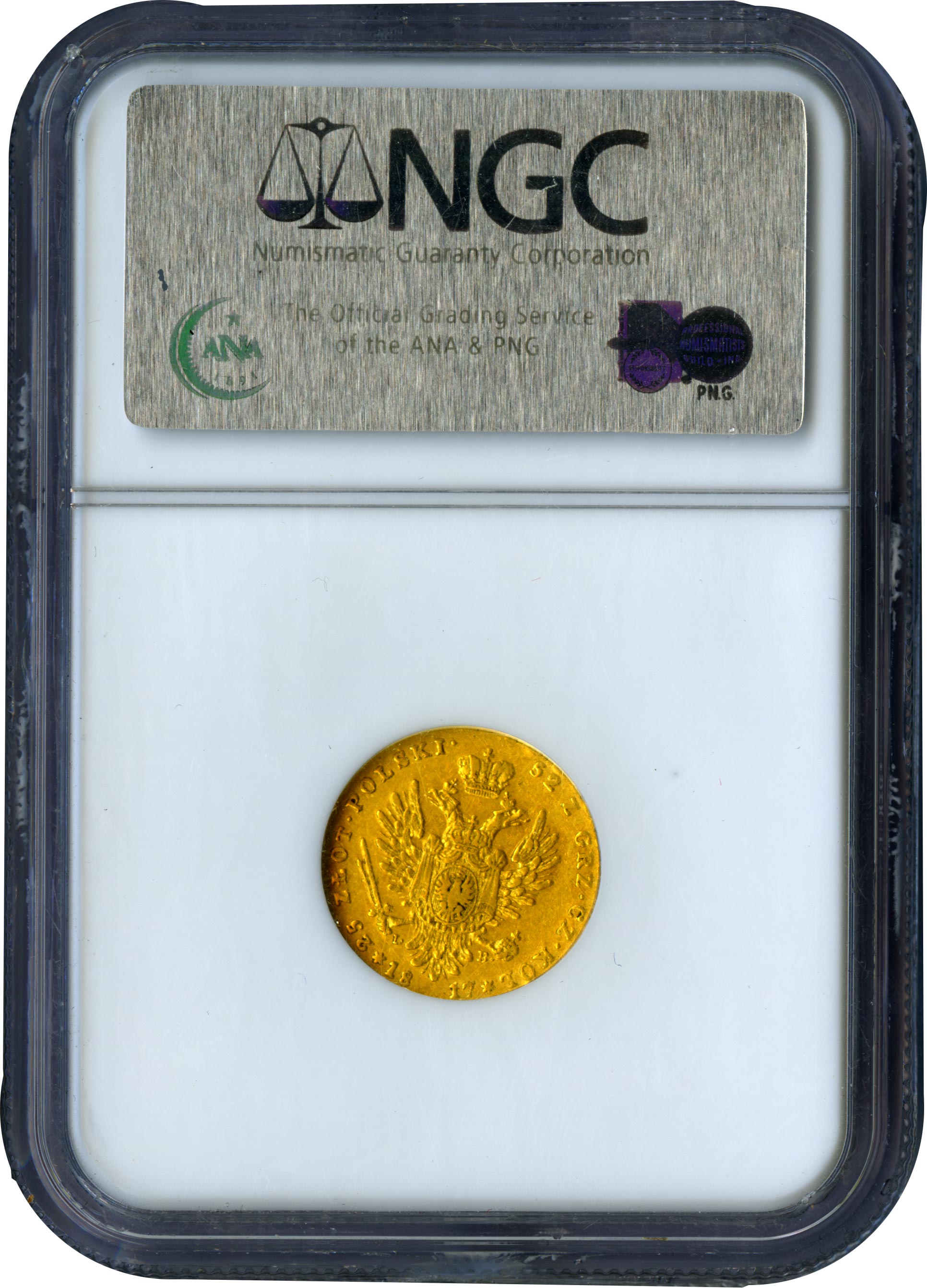 Лицевая сторона — портрет Александра I, оборотная — российский двуглавый орел с польским гербом на груди. Проба — 917, нормативный вес — 4,91 грамма, гурт — шнур или ребристый.