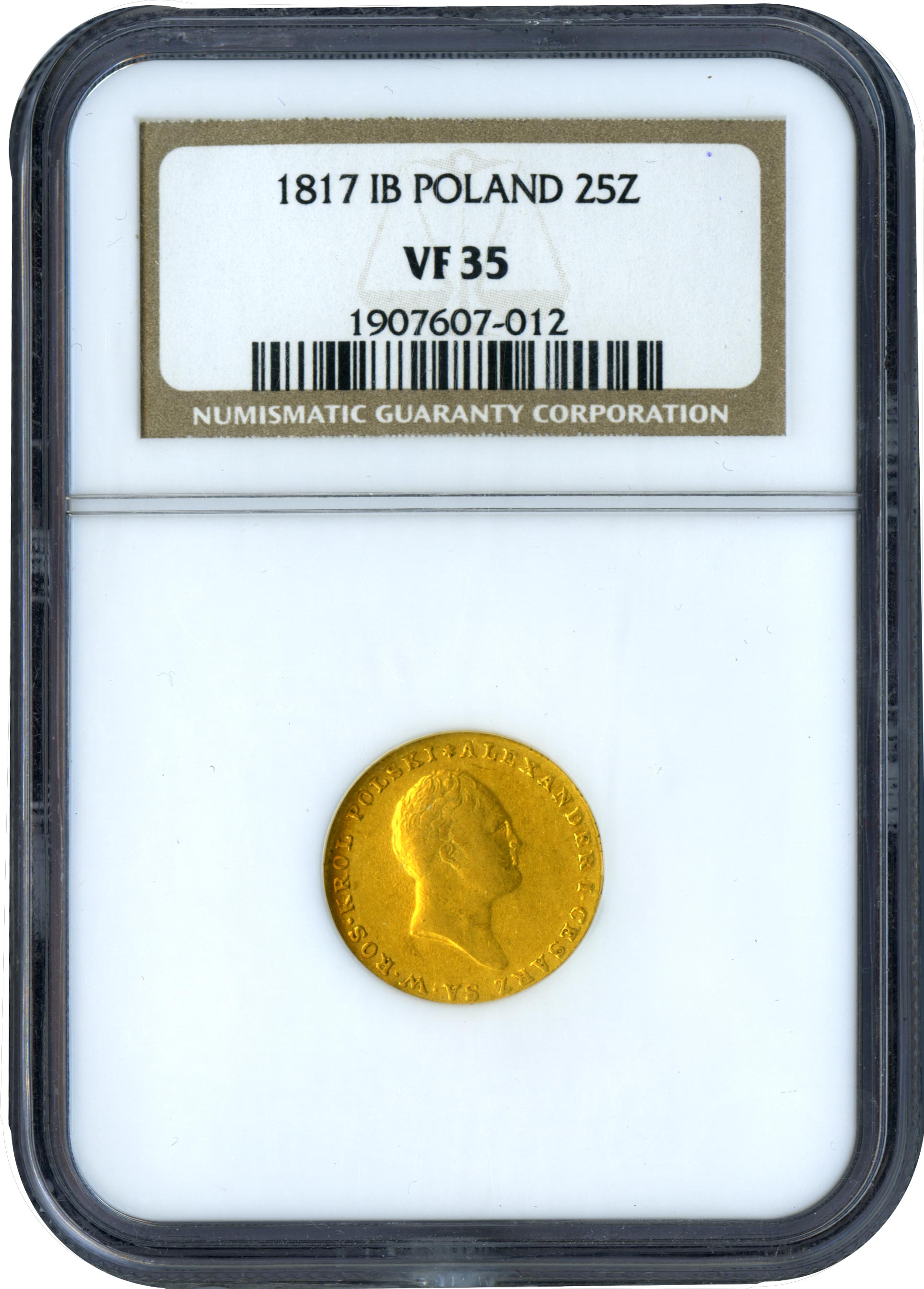 На гербовой стороне золотых, серебряных и медных монет 1816-1835 годов на груди российского орла помещен герб Польского королевства под королевской короной и пологом. В надписи на оборотной стороне золотых монет, кроме номинала, указано их количество в штуках (52) в золотой кёльнской марке.