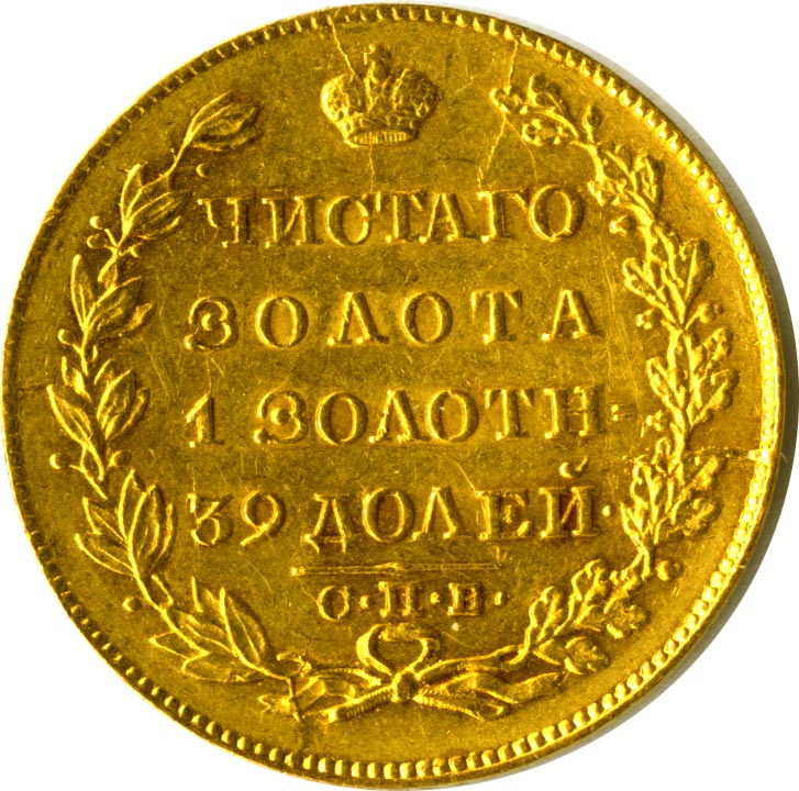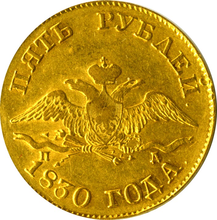 Лицевая сторона - «масонский» орел, дата и надпись «ПЯТЬ РУБЛЕЙ»; оборотная - венок из лавровой и дубовой ветвей вокруг надписи «ЧИСТАГО ЗОЛОТА 1 ЗОЛОТН 39 ДОЛЕЙ». Проба — 917, нормативный вес — 6,54 грамма,