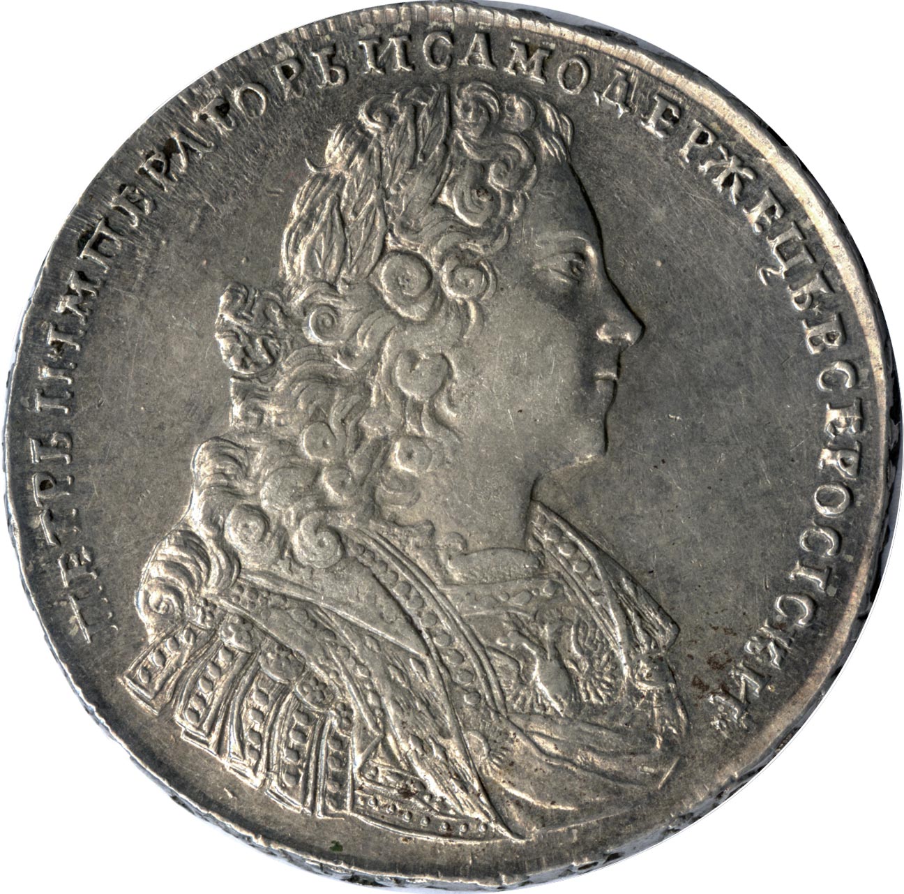 Гурт - «россискоi рубль московского двора». Легенда лицевой стороны - «Петр II император и самодержец всеросiски», оборотной - «Монета новая цена рубль» и дата арабскими цифрами. Проба - 729, нормативный вес — 28,44 грамма.