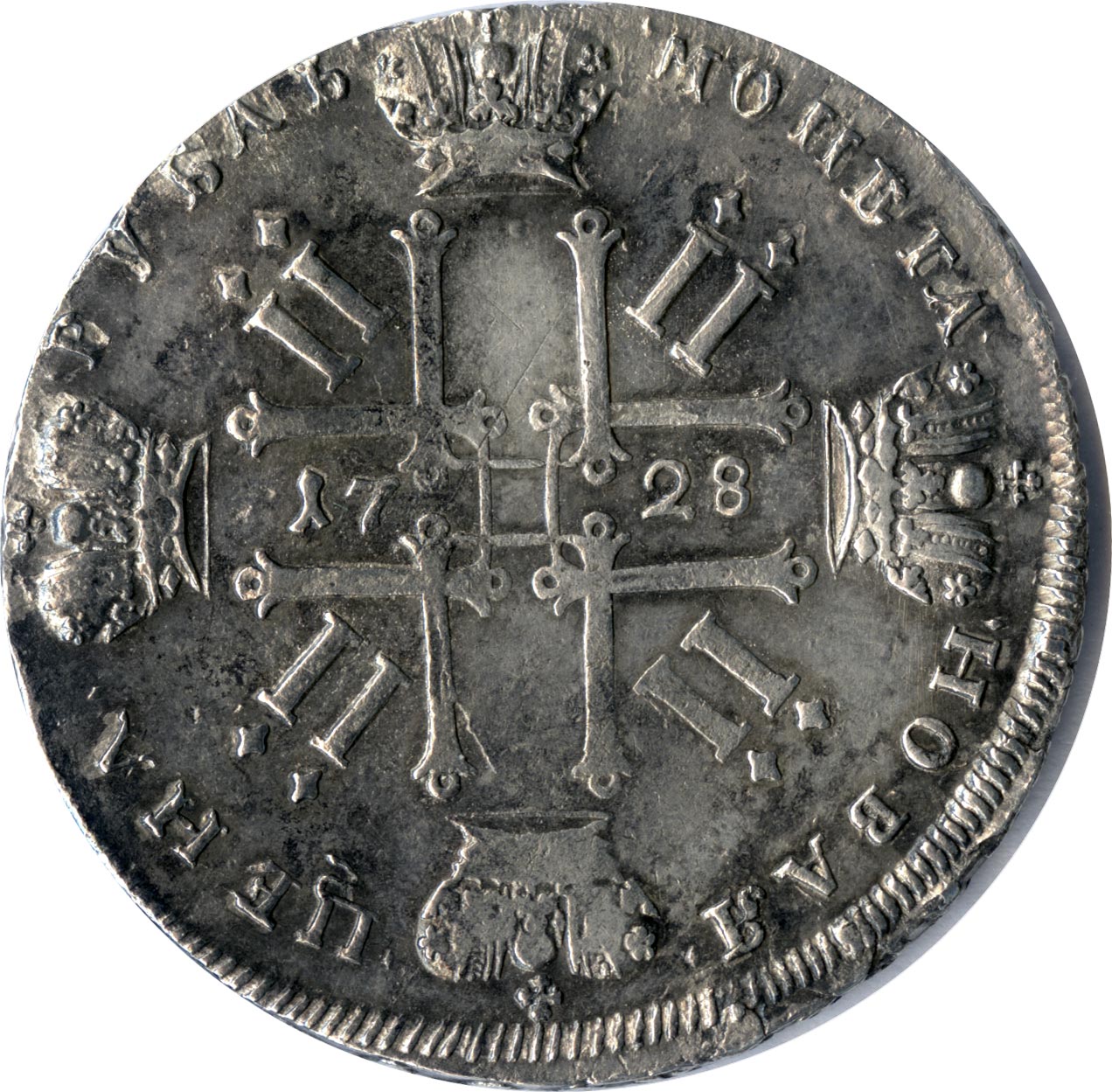 Рубль 1728-1729 годов «Голова внутри надписи»