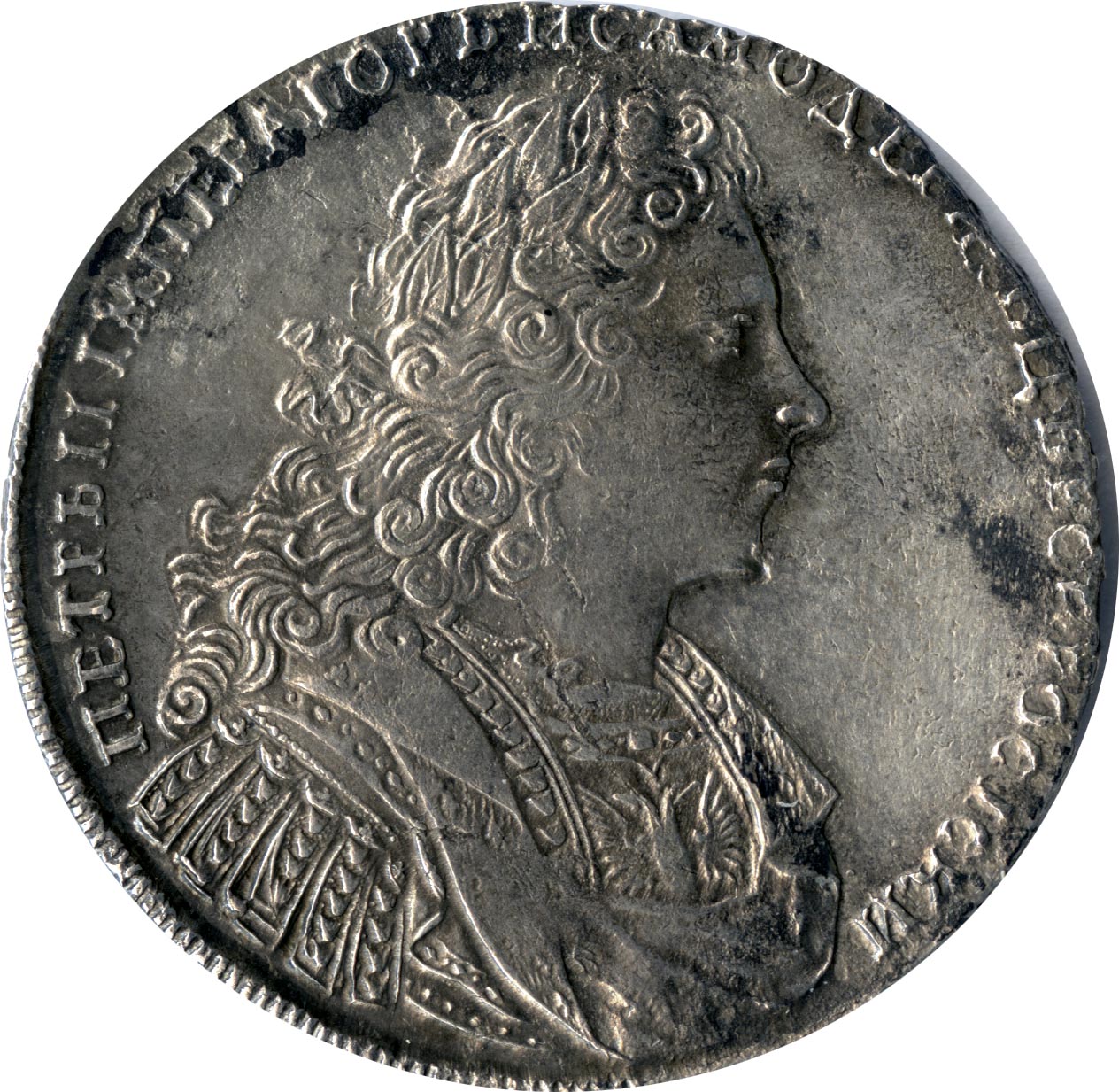 Гурт - «россискоi рубль московского двора». Легенда лицевой стороны - «Петр II император и самодержец всеросiски», оборотной - «Монета новая цена рубль» и дата арабскими цифрами. Проба - 729, нормативный вес — 28,44 грамма.