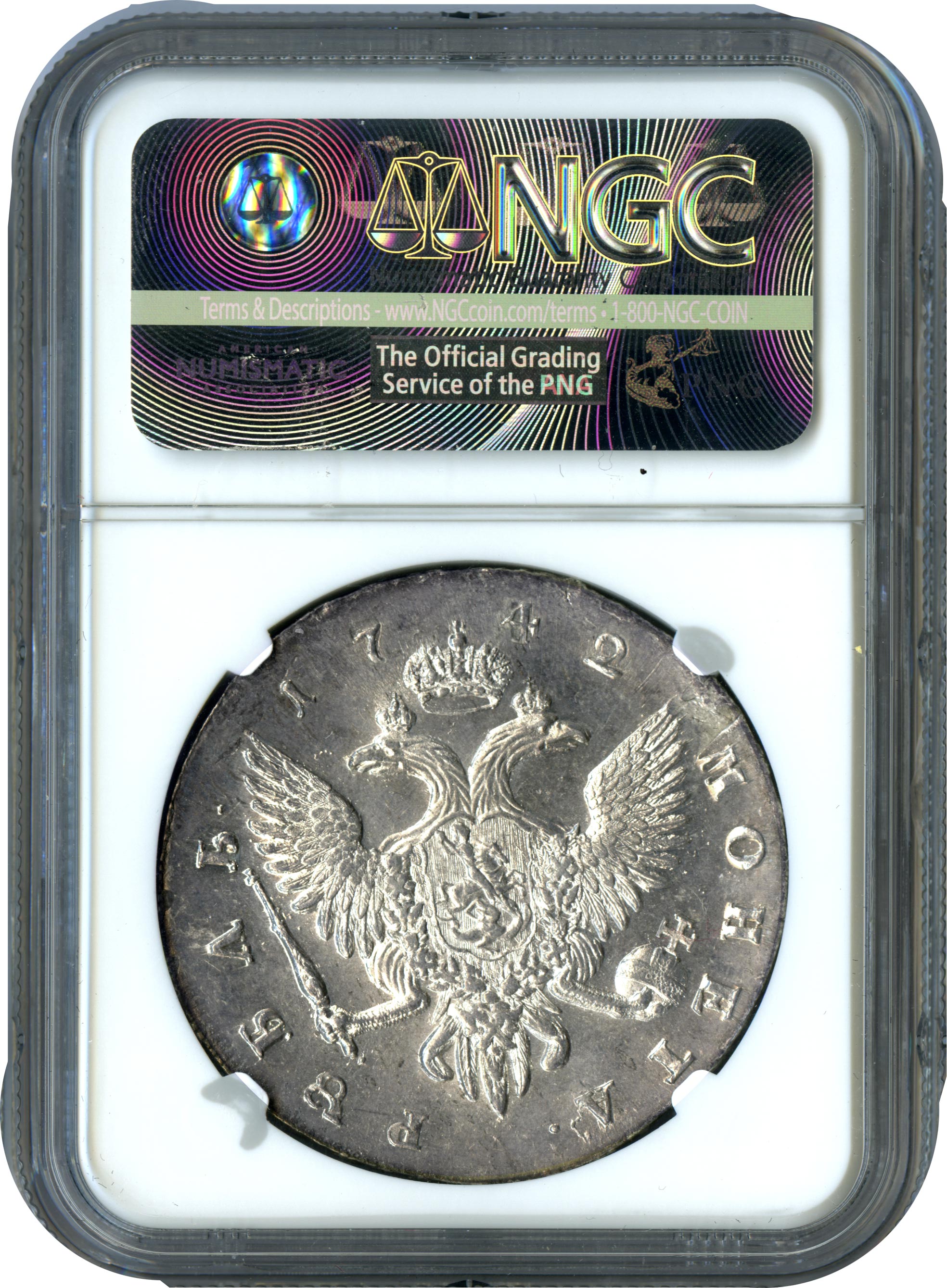В 1741 году появляется и новый петербургский тип рубля — портрет погрудный, в плаще, без орденского знака (кроме очень редких монет этого года, выполненных штемпелями московского типа 65). Этот тип не меняется до 1754 года. С 1743 года такое же оформление получают петербургские полтины.