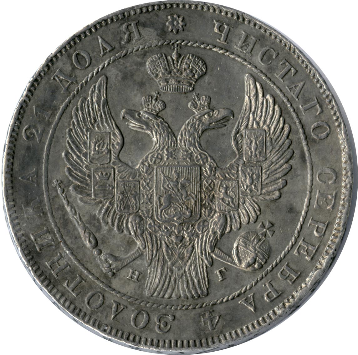 В январе 1830 года Николай I дает министру финансов Е. Ф. Канкрину устное указание «о сделании на золотых и серебряных монетах орла как на платиновых». На новом гербе крылья орла подняты, на них размещены шесть местных гербов — казанский, астраханский, сибирский, польский, херсонесский и финляндский. На груди орла — московский герб, на головах — короны. С 1832 года заодно с орлом изменяются и композиции обеих сторон монет: на лицевой стороне содержание чистого серебра в монете теперь обозначает круговая надпись, слово МОНЕТА на оборотной подчеркивает нарицательную стоимость, отличая полновесное денежное средство от рубля ассигнациями (нужно помнить, что доставшаяся Николаю в наследство от трех прежних правлений масса обесцененных бумажных денег является острой экономической проблемой. Правительство Николая удерживает объем ассигнаций строго на одном уровне, не прибегая к дополнительным эмиссиям; курс рубля ассигнациями колеблется вокруг 35 копеек).