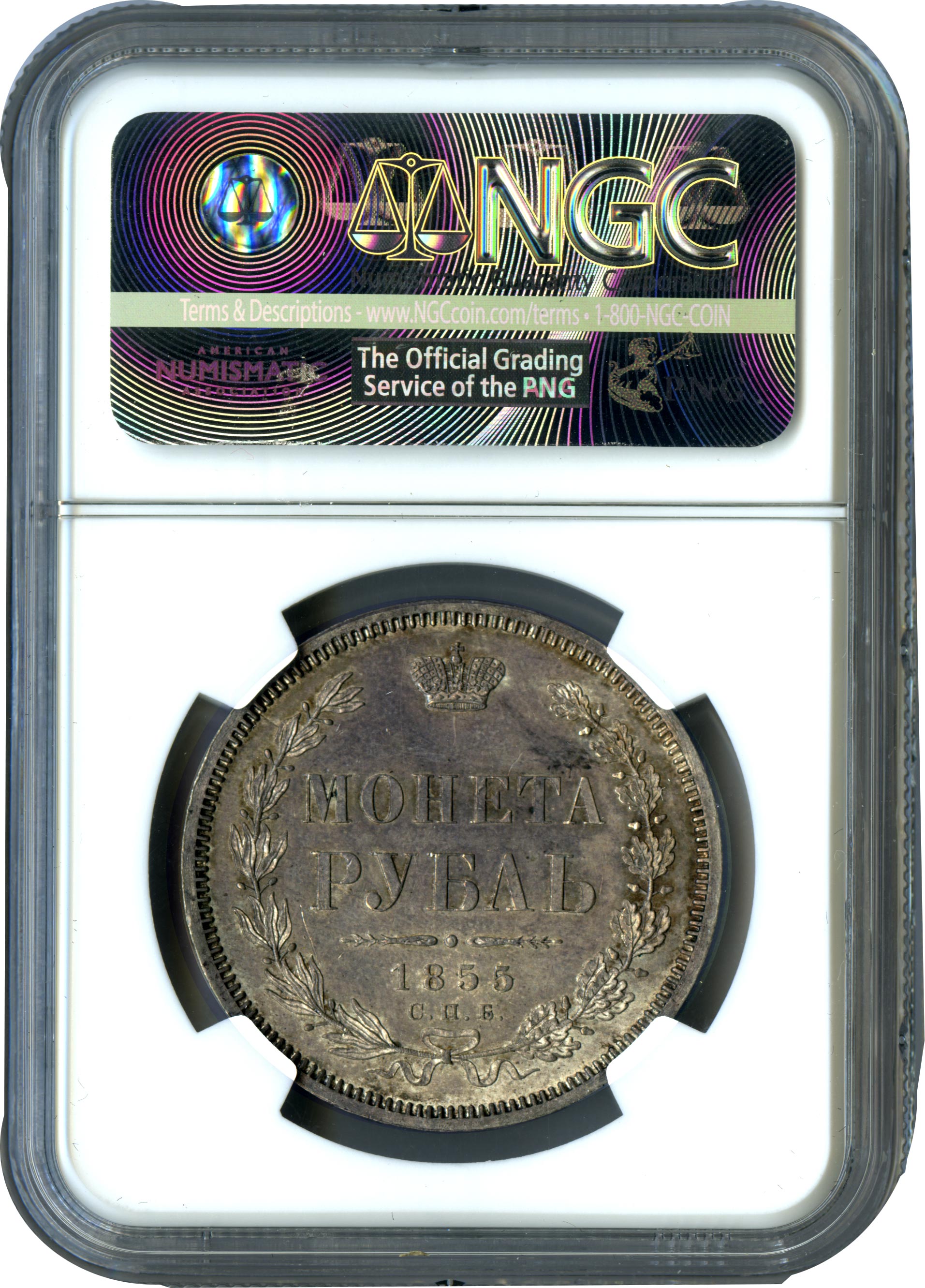 Лицевая сторона — новый гербовый орел с поднятыми крыльями и надпись «ЧИСТОГО СЕРЕБРА 4 ЗОЛОТНИКА 21 ДОЛЯ», оборотная — надпись «МОНЕТА РУБЛЬ», окруженная венком из лавровой и дубовой ветвей и дата.